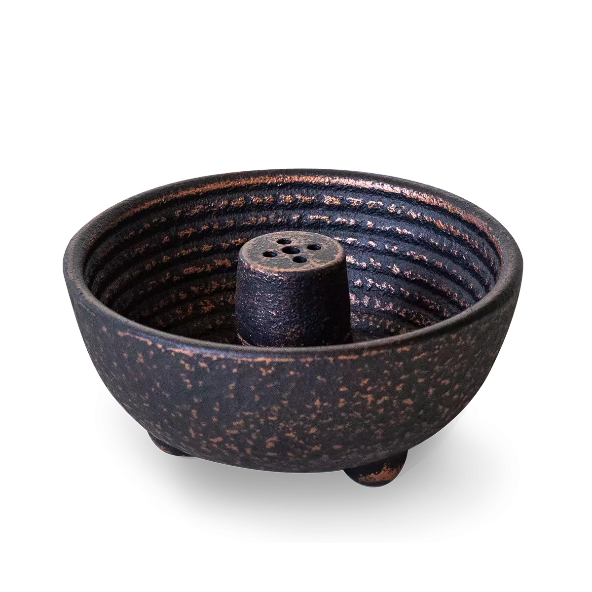 Öntöttvas füstölőtartó öt füstölőpálcika számára kialakított mélyedésekkel. A talp füstölőkúpnak is helyet biztosít.