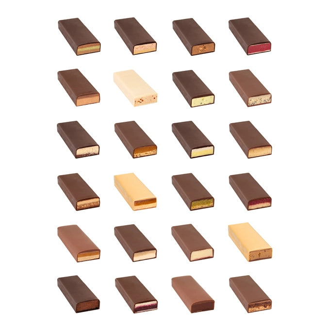 Ein schicker großer Wandkalender, gefüllt mit 24 verschiedenen handgeschöpften Schoko-Minis in verführerischen Sorten wie Butterkaramell, Eierlikör, Marc de Champagne, Himbeeren und Lebkuchen mit Früchten.