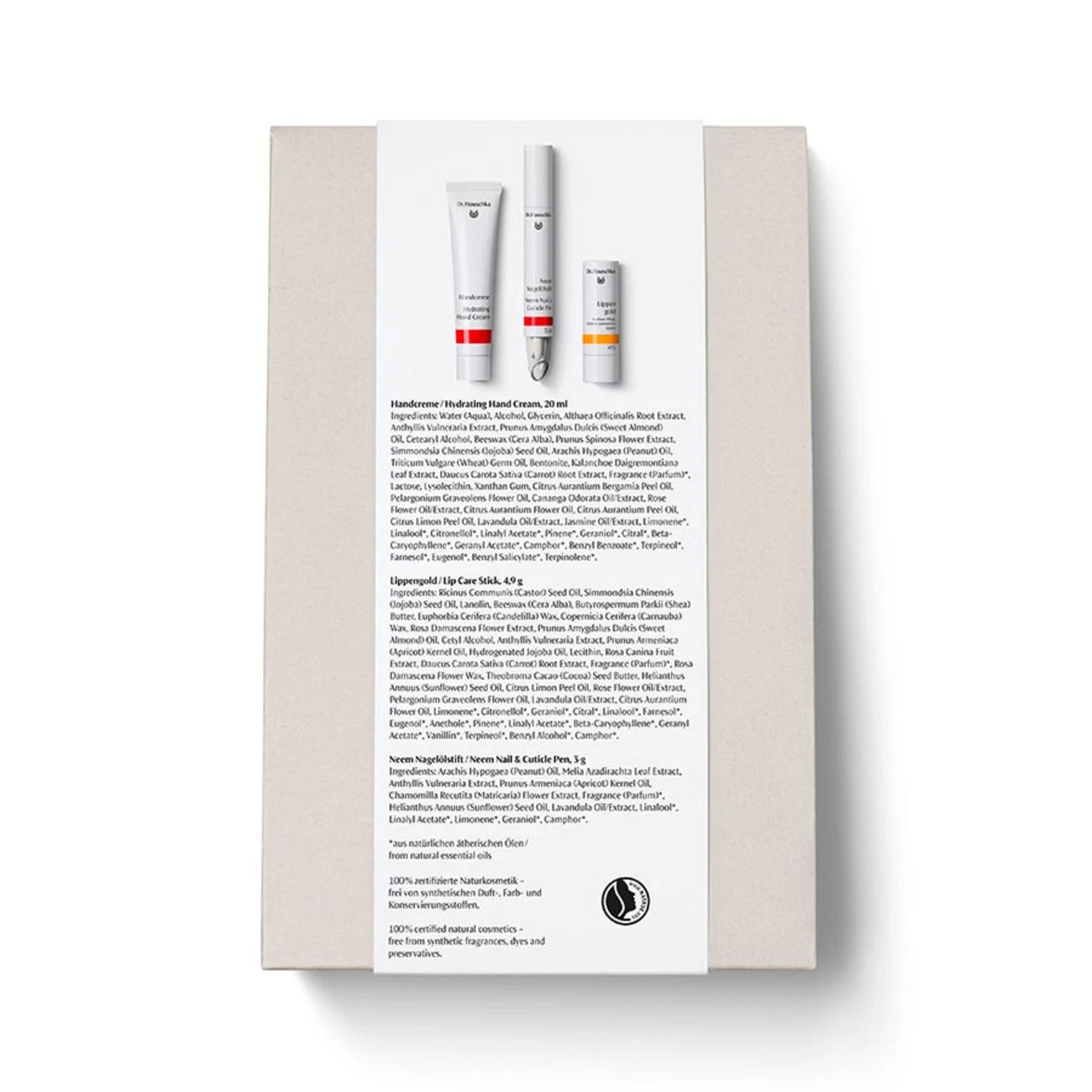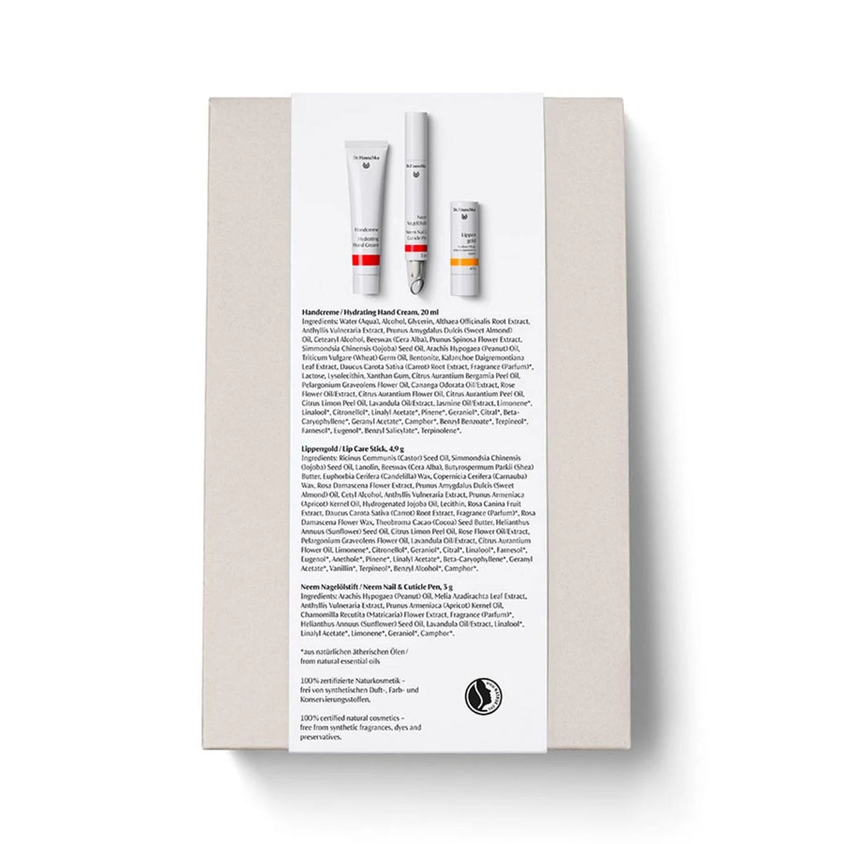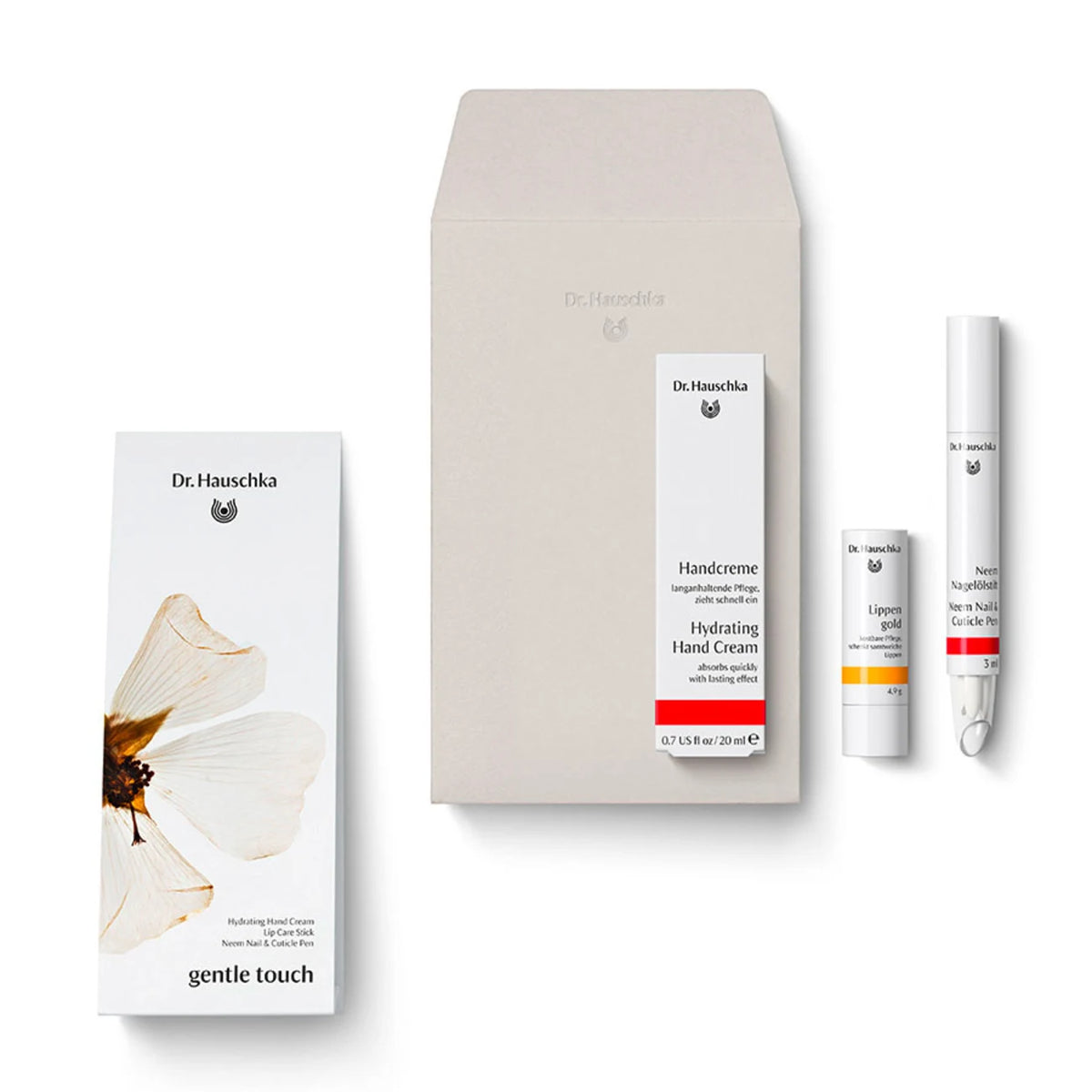 Pflegeset für Hände und Lippen: Dr. Hauschka Geschenkset „gentle touch“. Mit diesem Pflegeset für Hände und Lippen verschenkst du eine liebevolle Geste, die sowohl Hände als auch Lippen verwöhnt. Der Neem Nagelölstift sorgt für intensive Pflege und stärkt die Nägel, während das Lippengold mit hochwertigen Ölen trockene Lippen intensiv pflegt und zart macht. Unsere bewährte Handcreme schenkt strapazierten Händen spürbare Geschmeidigkeit und schützt vor Trockenheit. Dieses Set bietet kleine Wohlfühlmomente, die große Wertschätzung ausdrücken, und ist das perfekte Geschenk für alle, die sich etwas Besonderes gönnen möchten. Das Geschenkset „gentle touch“ enthält: Neem Nagelölstift – pflegt intensiv und stärkt gesunde Nägel Lippengold – macht trockene Lippen wieder zart Handcreme – spendet Feuchtigkeit und Geschmeidigkeit